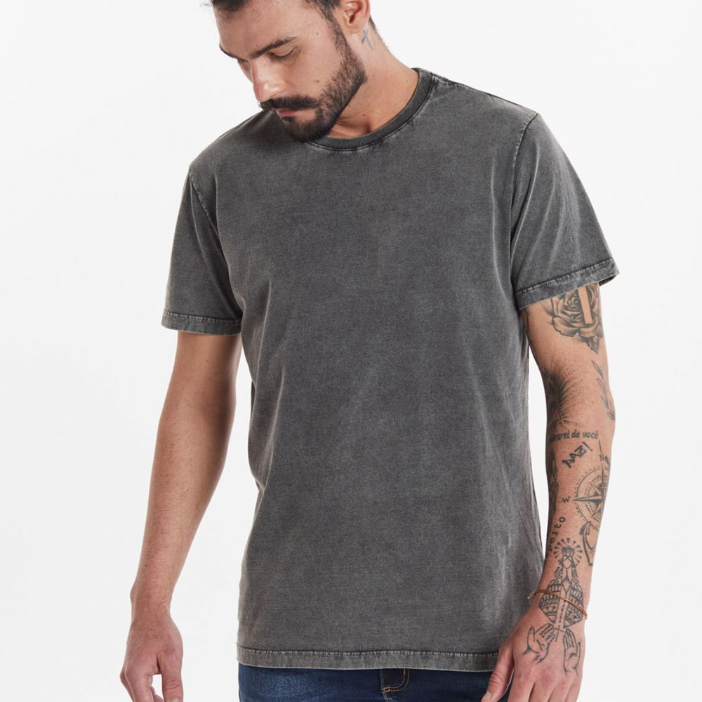 Malha premium, beneficiada com tratamento que alivia torções e encolhimento. A peça é tingida no reativo, depois passa por um processo de marmorização que dá uma característica rústica a peça. O desgaste é previsível.